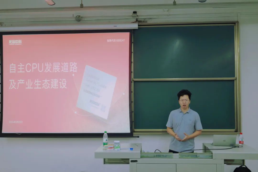 而后,叶骐宁总监围绕公司介绍、自主CPU发展背景、自主CPU发展道路及产业生态建设等四个方面开展讲座。他以一段介绍龙芯中科的视频开场,吸引在场师生的注意力。他提到,龙芯中科技术股份有限公司(以下简称“龙芯中科”)是一家专注于CPU自主研发和产业化应用的高新技术企业,公司以“自主创新,产业报国”为发展理念,致力于构建安全、可靠的信息产业体系。他向大家详细介绍了“龙芯中科”的成长历史、产业生态体系等情况。他谈到,伴随着中国信创产业的市场需求的扩大,建立自主信息技术产业生态体系和人才体系势在必行。龙芯的LoongArch处理器指令集和架构成为与X86、ARM并列的顶层开源生态系统(自主+兼容),已经融入金融、能源电力、教育等多个领域,当前,龙芯自主架构应用也走出了国门,实现了重大突破。